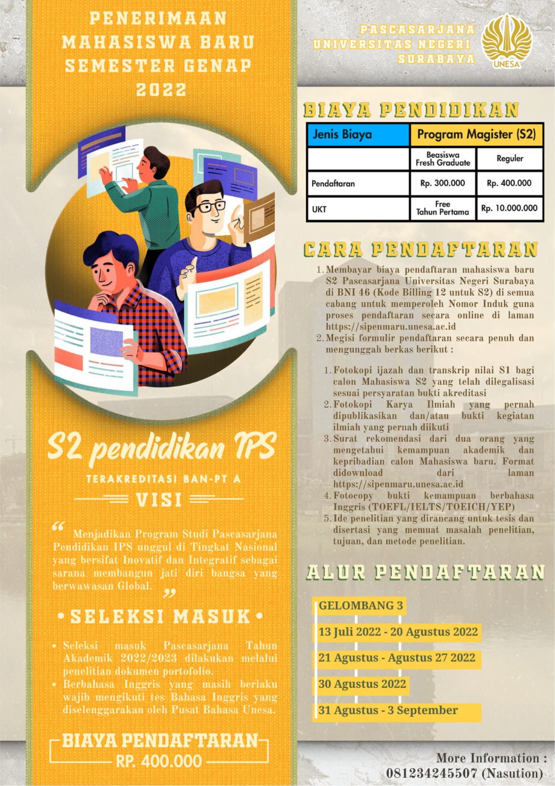 S2 Pendidikan IPS Unesa menerima mahasiswa baru untuk Semester Genap Tahun 2021 (Mulai Kuliah Februari 2022). Kami menerima calon mahasiswa dari latar berbagai belakang seperti, S1. Pend